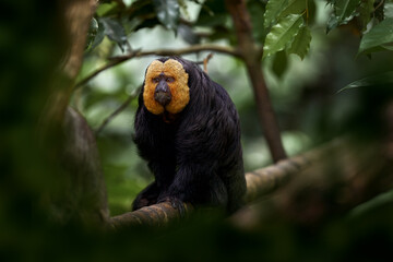White-faced Saki, Pithecia pithecia, detail portrait of dark black monkey with white face, animal in the nature habitat, wildlife from Brazil.