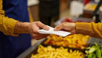 Close up of hands exchanging a receipt at a store counter near french fries Customer service and transaction concept