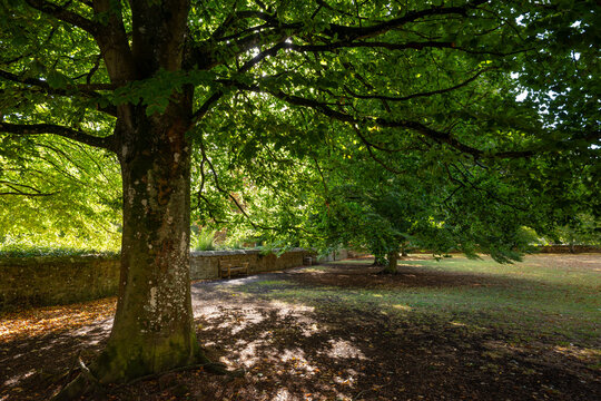 Early autumn scene in a park in Salisbury, Wiltshire, UK.  Trees with fallen leaves on the ground.