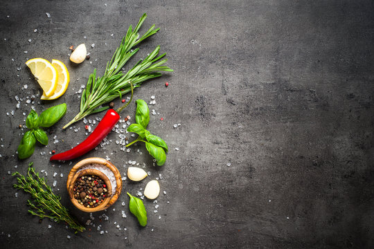 Coarse salt & fresh herbs on rustic wooden surface for natural cooking