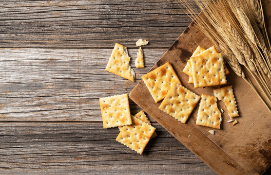 Eye level view of small stack of saltine or soup crackers, also known as soda crackers over white.