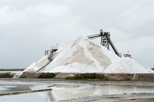 Industrial scene of aigues mortes saltworks  salt mountain and machinery in french marshes