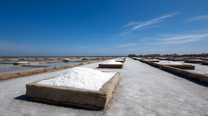 Sunlit saltworks with vast rectangular pans holding water and piled salt crystals under a clear blue sky