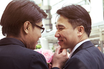 homosexual couple celebrate wedding ceremony outside in garden, LGBT, men kissing each other. Soft focus