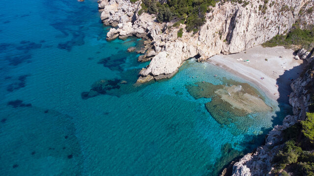 Aerial view of turquoise blue Mediterranean water on the coast of Samos, Greek Aegean Sea