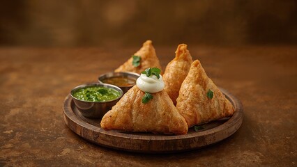 Samosa snack with tangy curd and dual mint chutney dips