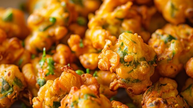 A close-up of golden-brown pakoras, crispy Indian fritters made with chickpea flour and assorted vegetables.