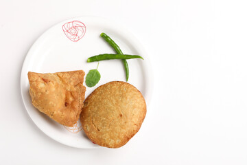 Kachori and potato samosa with green chilly in plate. famous spicy snack in india