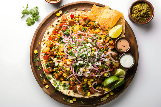 Board and plate of tasty Chaat with on white background.
