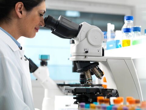 Unrecognizable young female scientist preparing samples to look them through a microscope in a laboratory. Laboratory research concept.