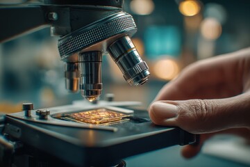 Close-up of a scientific microscope with a hand and illuminated sample