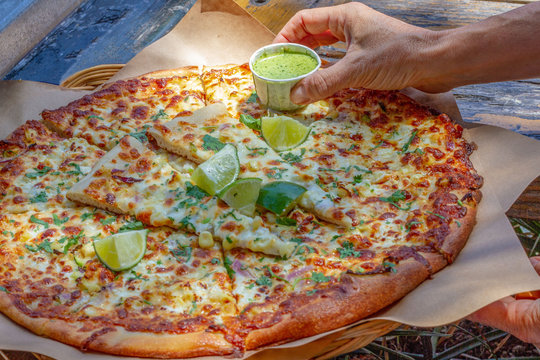 Artisan cheese pizza with corn, onion, pasilla peppers, mozzarella and Valbreso feta cheese, garlic olive oil, cilantro, and lime, with two sample slices on top and a small container of green sauce.