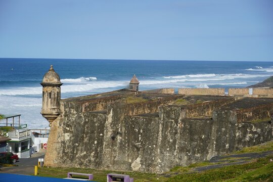 Beautiful panoramic view of the large outer wall with sentry box of fort San Cristobal in San Juan, Puerto Rico