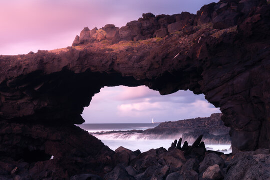 The magic silhouette of Kicker Rock (Leon Dormido) by the coast of San Cristobal island inside the Galapagos Islands national park, Ecuador.