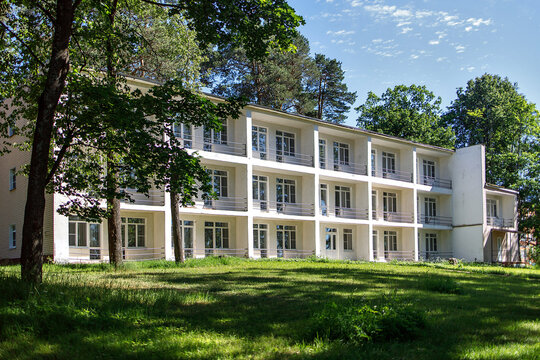 A typical three-story building of a sanatorium near Moscow with balconies on the river bank