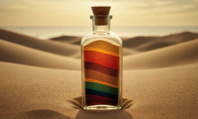 A bottle filled with sand containing a colorful rainbow, great for use in decorative designs and illustrations