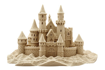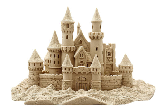 Intricate sandcastle featuring multiple towers and detailed architecture, isolated on a white background, transparent background.