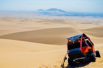 Dune buggy used to carry tourists practicing sand-boarding on the dunes in Huacachina desert, Peru