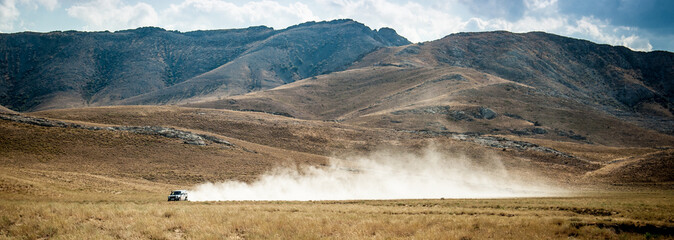 The car drives quickly through the mud with clouds of dust from under the wheels, against the backdrop of the mountains. Rally Dakar. Off-road vehicle rides off-road in the desert.