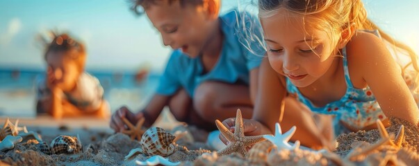 Beautiful seashell and starfish on sandy beach with gentle waves at sunset