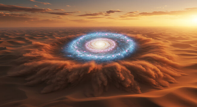 Abstract desert scene, sand vortex portal, futuristic galaxy background