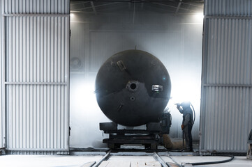 Sand blasting process, Industial worker using sand blasting process preparation cleaning surface on steel before painting in factory workshop.