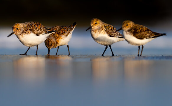 Small sanderling birds walking on wet ground