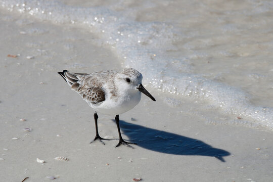 Portrait of adult sanderling (Calidris alba) walking along the sandy beach with shells