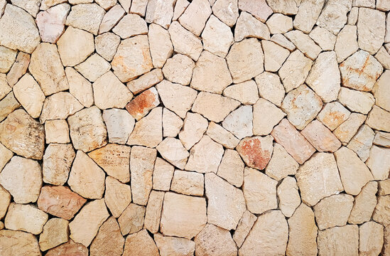 Photography close-up view of a dry stone wall made of various stones arranged in a geometric pattern. In Mallorca