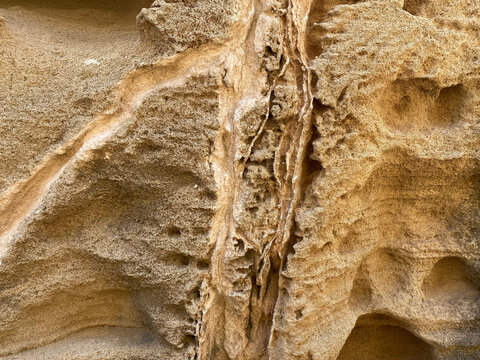 A beautiful geological formation with a figured crack. Warm sandstone in sunlight. Cyprus, 2022.