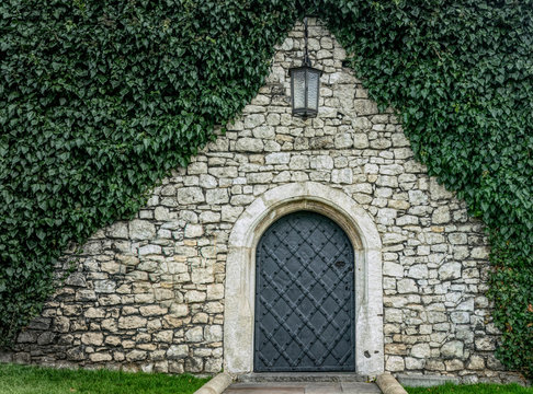 Antique wrought iron door and brick wall. Old English traditional architecture