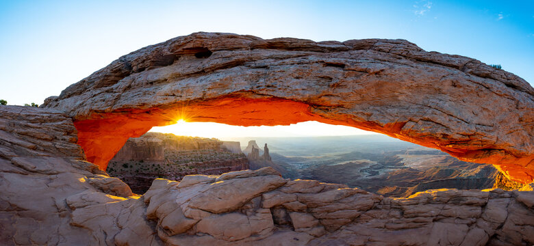 Enchanting sunburst over dramatic sandstone canyons in desert dawn