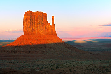 Panoramic view of famous Merrick butte mesa with vibrant red orange rock color on horizon in Monument Valley canyons during sunset in Arizona