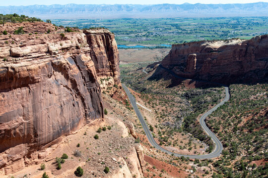 High angle panoramic view over Monument Canyon with the road winding to the Rimrock Drive on top of Colorado National Monument plateau near Grand Junction, Colorado, USA