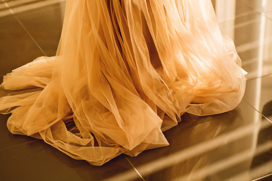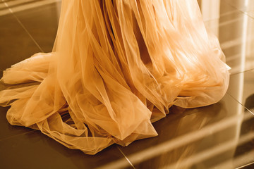 Elegant wedding rings on soft blue veil background