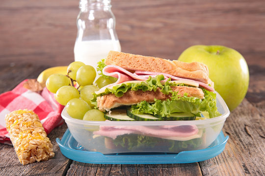 Healthy business lunch at workplace. Sandwich, vegetables, fruid and water lunch box on working desk with laptop, glasses.