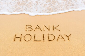 Ocean wave washes over "Bank Holiday" written in the sand.