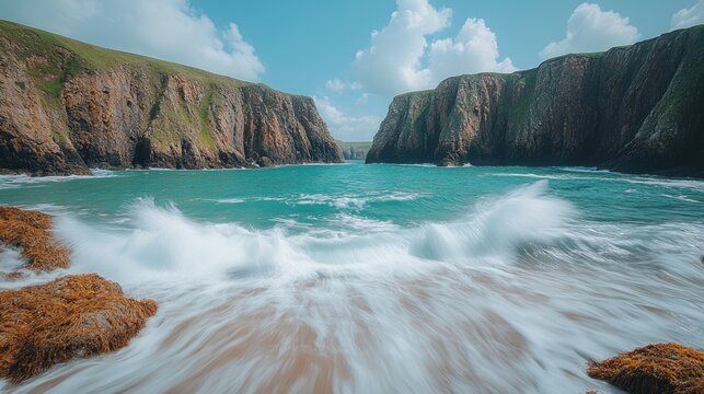 Serene coastal inlet with turquoise water, crashing waves, and sandy beach nestled between dramatic cliffs under a bright sky.