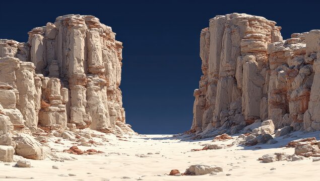 A vast, sun-drenched desert canyon.  Towering,  pale sandstone cliffs frame a  wide, sandy path