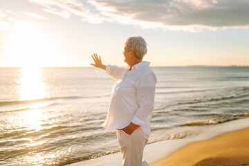 Couple walking hand in hand at sunset on sandy beach with gentle waves