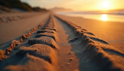 Wheel tracks stretch along sandy beach towards sunset over sea. Tire imprints pattern on sand, path to horizon in natural landscape. Car or truck trail marks the golden hour light.