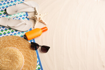 Beach towel, hat, sun protection products and flip flops on sand, flat lay. Space for text