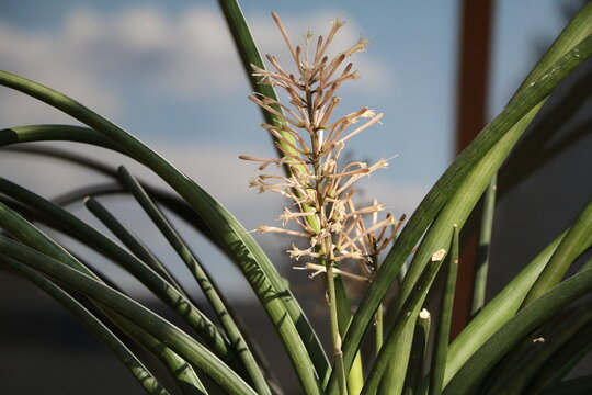 Sansevieria Cylindrica (Dracaena Angolensis) with flowers. Close-up of blooson Cylindrical Snake Plant, also known as the African spear or spear sansevieria in blossom.