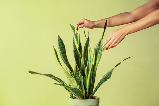 Unrecognizable female touching fresh leaf of Sansevieria Trifasciata on green background in studio