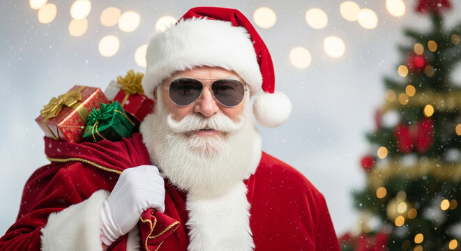 Cool santa claus with sunglasses carrying a bag full of gifts in front of a christmas tree and lights, celebrating christmas and the new year