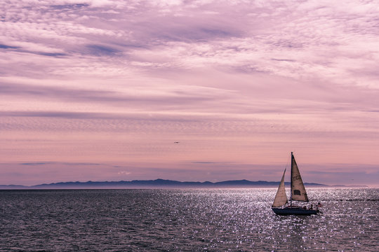 Boats in the harbor at sunset, in Santa Barbara, California.