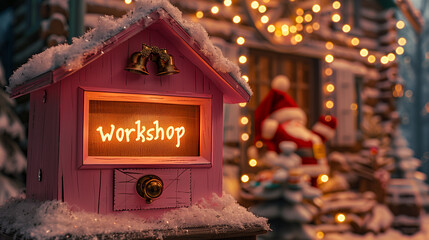 Vintage elves toy workshop sign festive Christmas decor warm cozy ambiance holiday Santa letter magic elf work shop factory north pole nostalgia banner