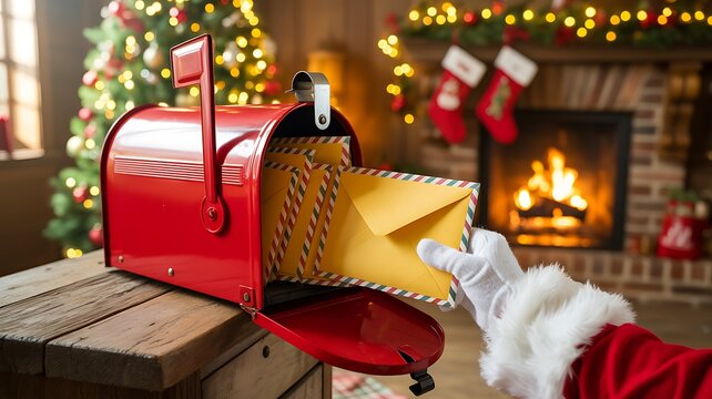 Christmas mailbox with letters near fireplace in cozy holiday home
