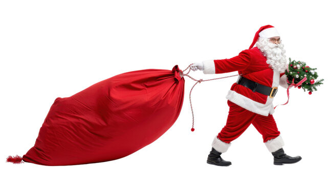 A jolly Santa Claus dressed in traditional red attire strides purposefully, his large red sack filled with gifts slung over his shoulder, ready for the festive season
