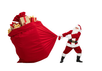 santa claus with gifts, Santa Claus pulling a huge sack full of Christmas presents against white background